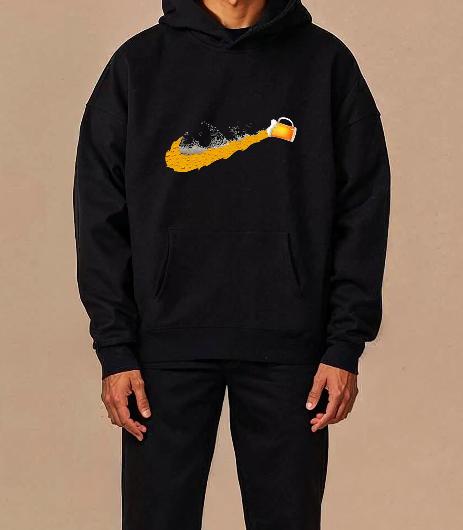 קפוצ'ון שחור עם גרפיקה מקורית – מזיגת בירה שיוצרת סימן ויזואלי המזכיר את לוגו ה־Swoosh. שילוב מושלם של סטייל ספורטיבי עם טוויסט מצחיק.➤ אידיאלי למסיבות, פאבים או סתם לשבת עם חברים.