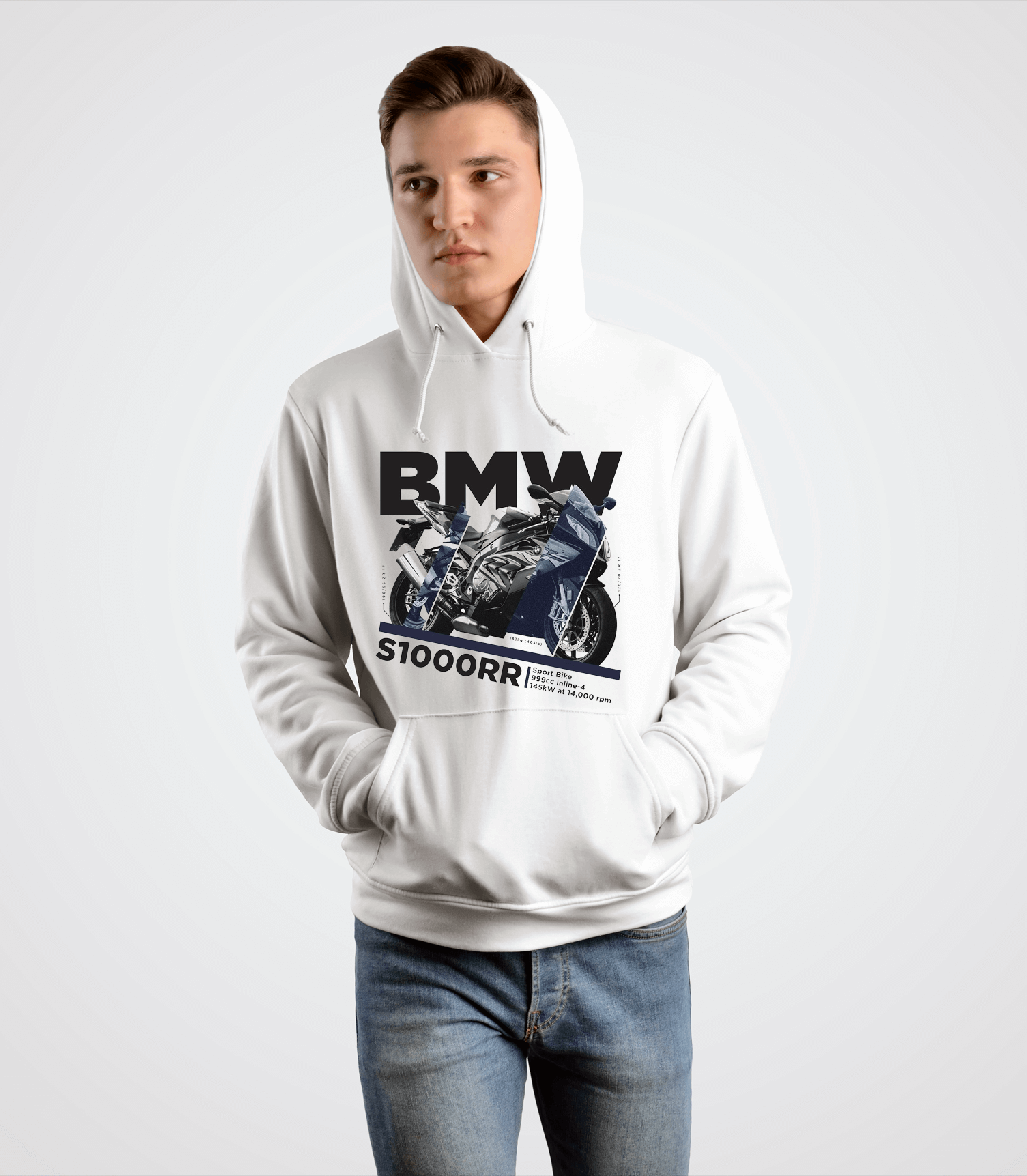 קפוצ'ון לבן עם הדפס מושלם לאוהבי אופנועים – גרפיקה של BMW S1000RR עם פרטי ביצועים.➤ חובה לכל ריידר שמחפש להראות לכולם את האהבה שלו לאופנועי על.