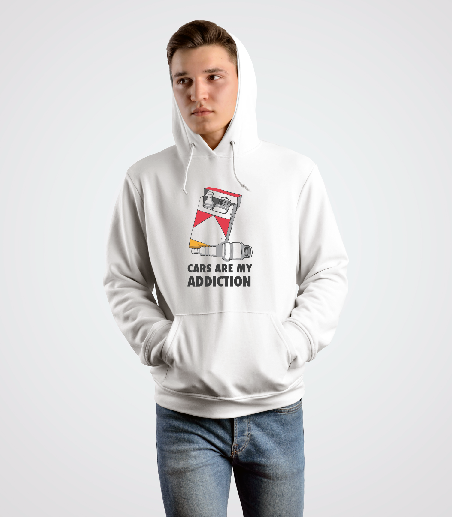 קפוצ'ון לבן עם הדפס ייחודי של קופסת סיגריות בסגנון גרפי, שבתוכה מחליף את הסיגריות פלאג לרכב. מתחת הטקסט: Cars are my Addiction. ➤ פריט חובה לחובבי רכב ומכונאות – שילוב של הומור, תשוקה ואופנת רחוב מודרנית.