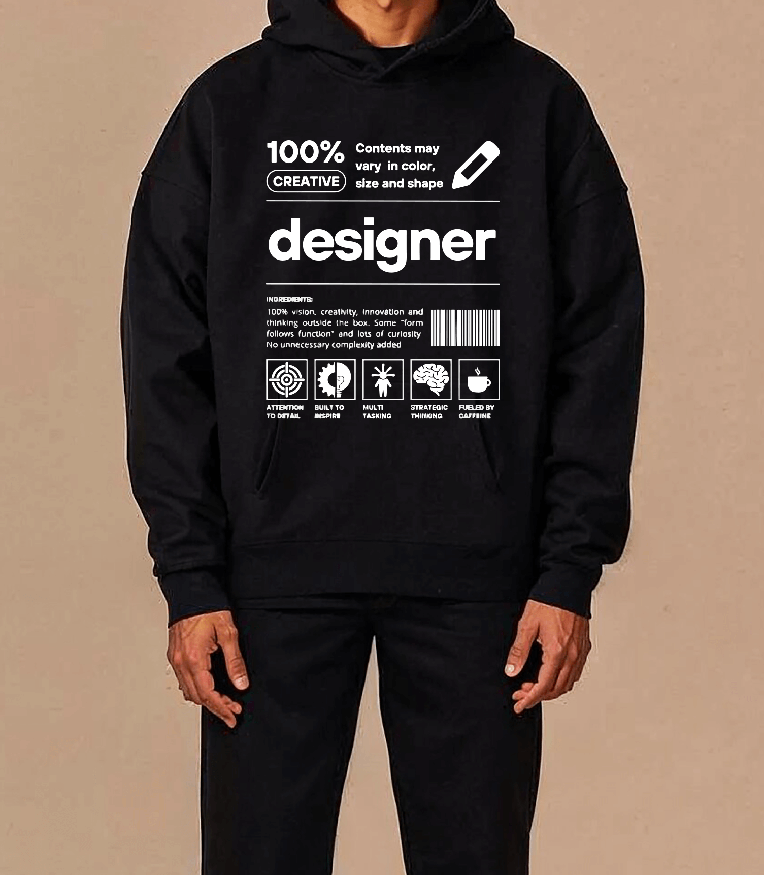 קפוצ'ון שחור עם הדפס מקורי בסגנון "תווית מוצר" – 100% Designer. כולל אייקונים ייחודיים המדגישים קריאייטיביות, חשיבה אסטרטגית ותשומת לב לפרטים. ➤ מושלם למעצבים, יוצרי תוכן וכל מי שחי על השראה וקפה.