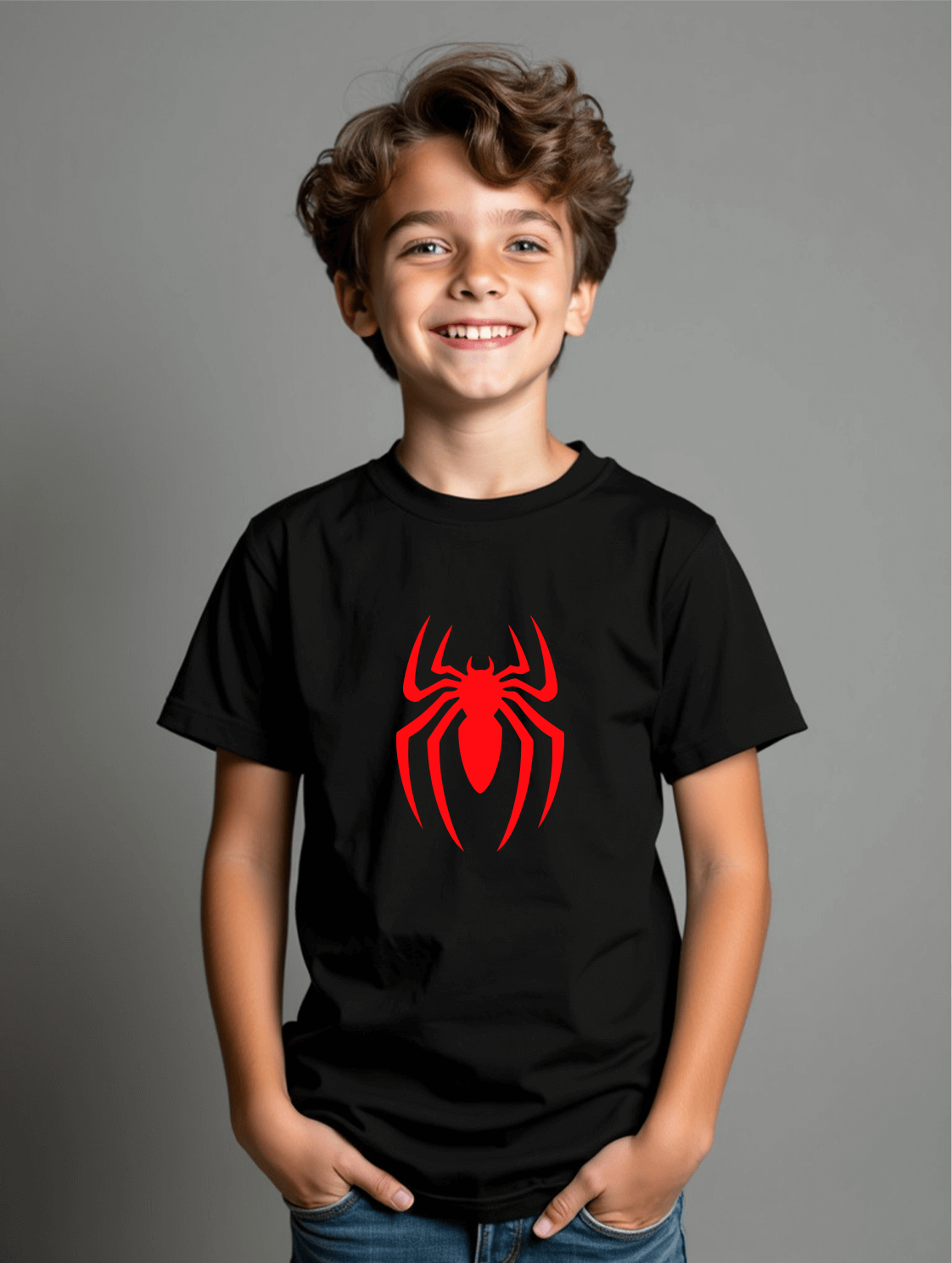 חולצת ילדים בצבע שחור עם הדפס מינימליסטי וסטייליסטי של סמל ספיידרמן.