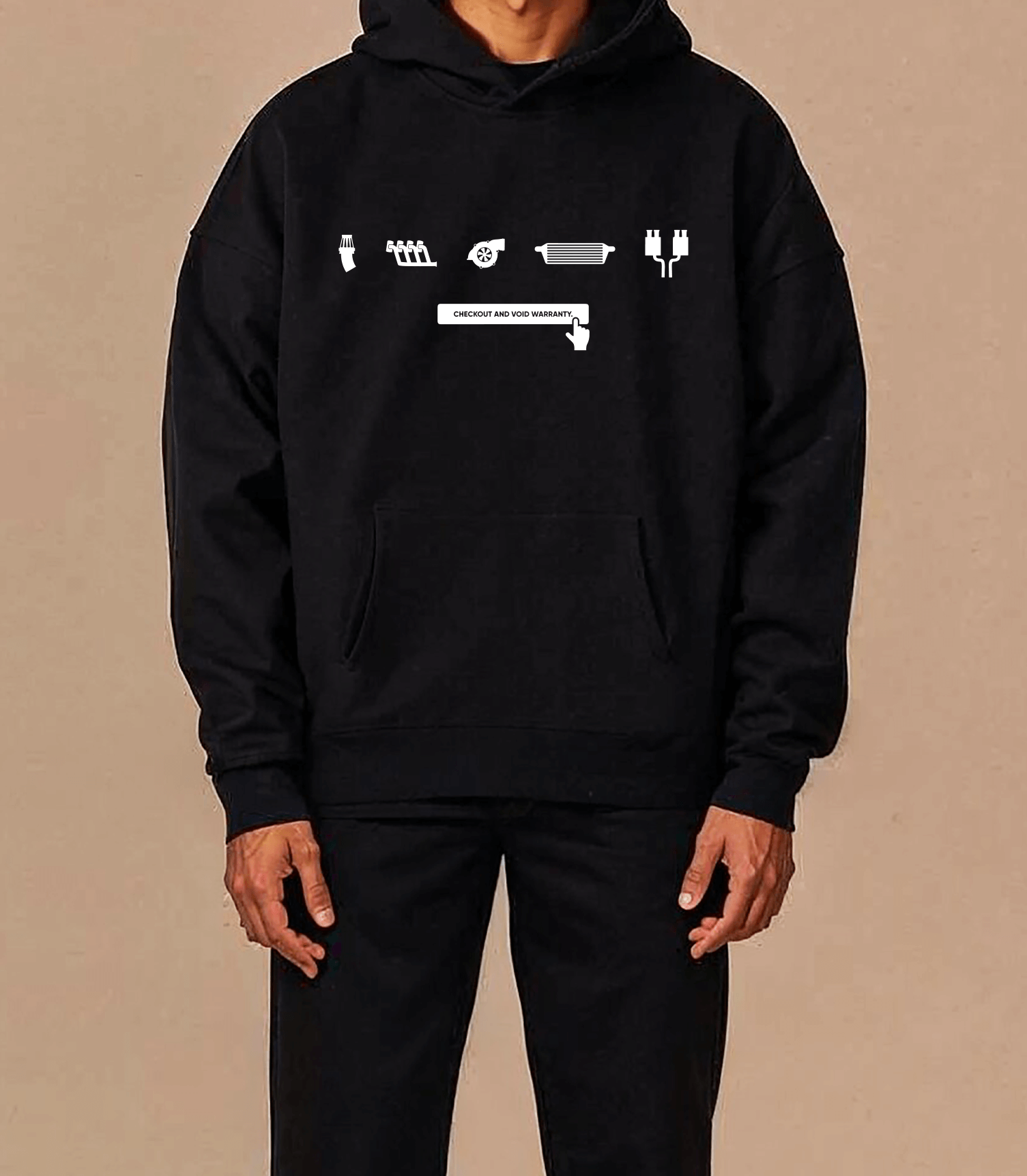 קפוצ'ון שחור עם הדפס סמלים מעולם הרכב והטקסט: Checkout and Void Warranty.